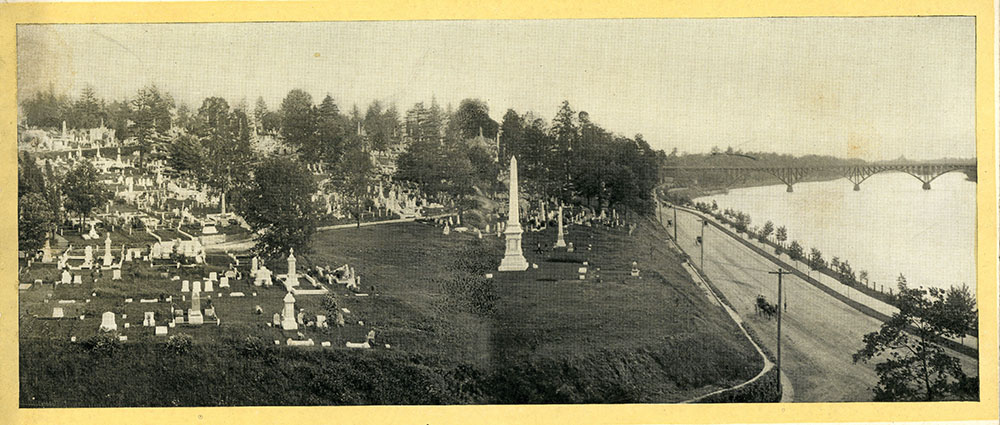 Laurel Hill West, founded in 1869, was laid out with panoramic river views and thousands of planted trees, many of which were specimens considered unusual at the time. In contrast to the monument-crowded, fenced-in properties popular in the original rural cemetery movement, the design of the earliest sections of Laurel Hill West was influenced by the “Landscape Lawn” plan which was developed by Adolph Strauch at Spring Grove Cemetery in Cincinnati in the 1850s.