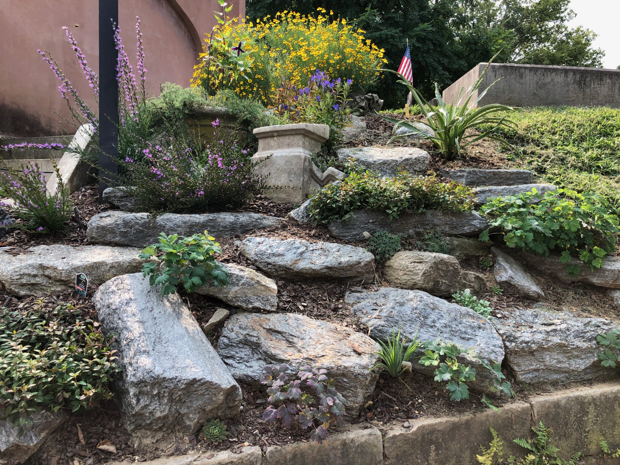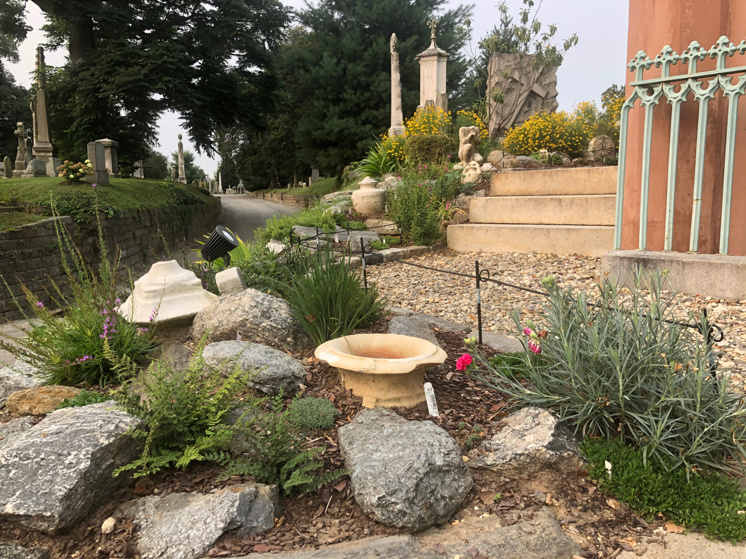The first thing you see when entering through the main gates of Laurel Hill East is the historic Old Mortality statue assemblage. This rock garden was created on the steep hillside beside the statues, featuring rare and interesting specimens of bulbs, ephemerals, and perennials that thrive on rocky slopes. The garden utilizes native Wissahickon schist as well as reclaimed architectural elements from the cemetery.