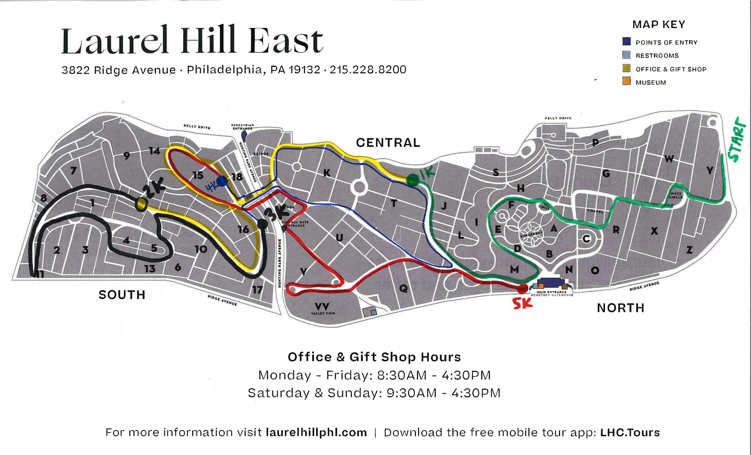 COURSE DESCRIPTION: Unique and challenging, the Run winds through Laurel Hill East, including the challenging hills and elevations of the South section. The course is ADA-accessible. Two water stations will be set up along the course. Kilometer markers and color-coded vinyl arrows on the pavement will indicate your race progress as well as direction.* Scroll down for course map.