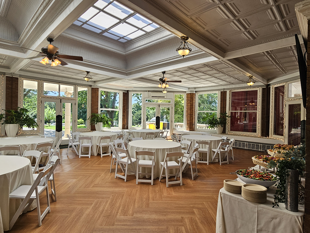• The Conservatory Greenhouse is a spacious and sun-filled setting that can seat up to 110 guests. For larger groups, the use of our cocktail room and outside veranda are also available, which can accommodate up to 100 guests.