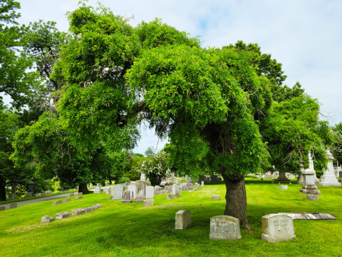 This very unusual weeping form of the Japanese Pagoda-tree (also known as the Chinese scholar-tree) is a state champion tree in Pennsylvania. These cultivars were common in the first half of the 19th century, and this tree likely dates back to the original cemetery plantings.