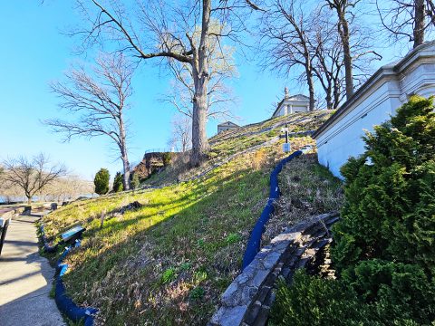 The goal of this project is to create an ecologically sensitive design that establishes a new native landscape providing food and refuge for wildlife, while also reducing erosion and stormwater runoff along the Kelly Drive frontage. We are currently in Phase III of the project, focusing on removing invasive species, stabilizing the hillside, and planting native grasses and forbs further north along the steep hillside that connects the cemetery with Kelly Drive and the Schuylkill River.